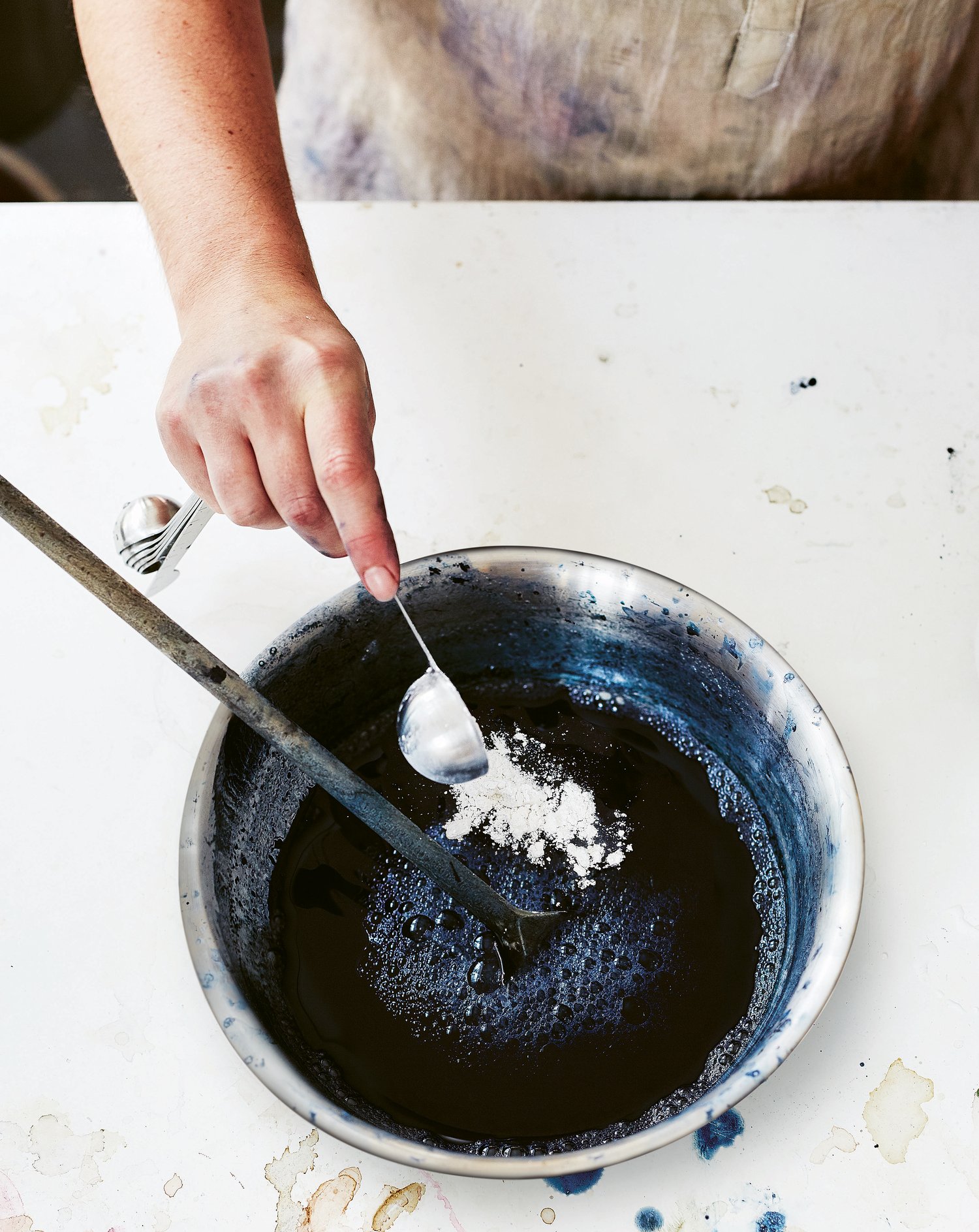 In terms of sustainability, the fact that it is not soluble in water, means that the amount of water used in the process is very minimal. And once in the vat, it stays there. It is never removed as the vat can continue to be balanced with the addition of more dye ingredients, to allow for more dyeing.