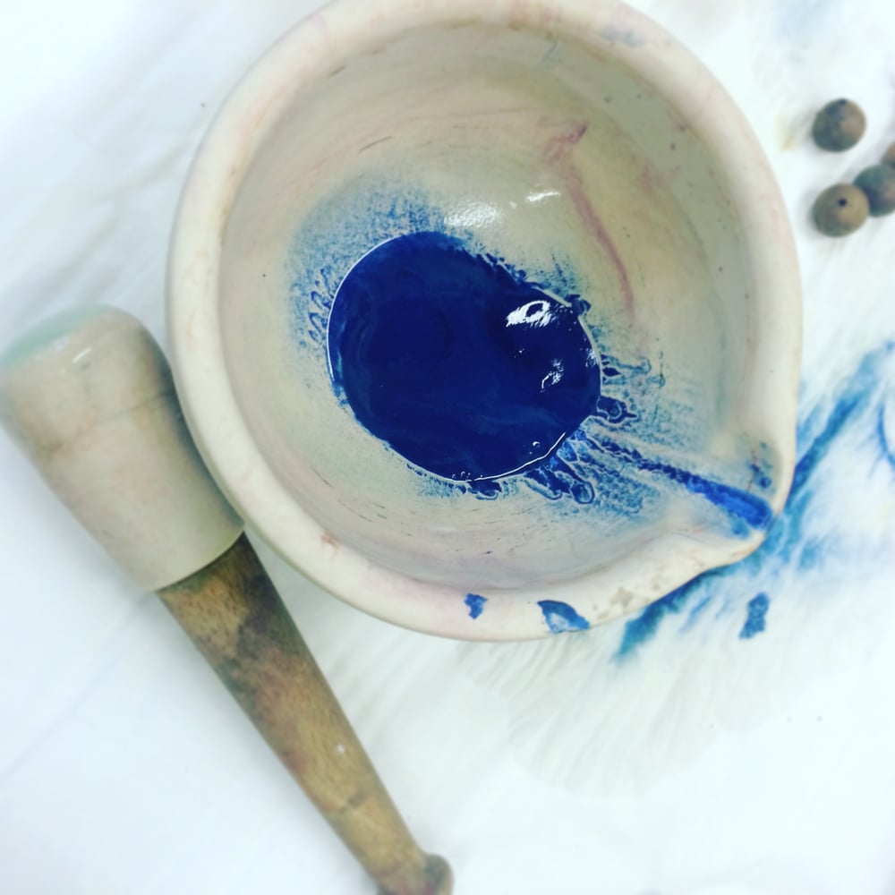 Indigo kits are available for an additional cost with all the materials required for the class included, with enough dye to shibori dye teh silk scarf included and one or two other small items of your own. The kit includes a 1/2 metre length of organic UK-grown peace silk, organic indigo extract powder, fructose, lime + twine for resist print making.